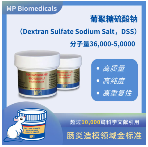 葡聚糖硫酸鈉(Dextran Sulfate Sodium Salt,DSS) 是一種聚陰離子衍生物,常用于誘導(dǎo)建立動物潰瘍性結(jié)腸炎模型,是目前腸炎造模研究領(lǐng)域金標(biāo)準(zhǔn)。MP Biomedicals 生產(chǎn)的DSS具有高質(zhì)量、高純度、高重復(fù)性的特點(diǎn)。迄今為止,有超過10,000篇科學(xué)文獻(xiàn)引用,有效性得到了業(yè)界廣泛認(rèn)可。